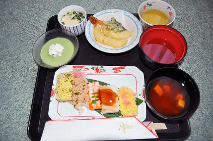 🎶 敬老の日 🎶 2019.09.12 9月16日は「敬老の日」です。本日少し早いですが、お祝いをしました。 お寿司に天ぷら、茶わん蒸しと豪華な昼食をご用意しました。 食後はお祝いの席をご用意し、プレゼントを渡しました。 皆様、これからもお元気でお過ごしください。