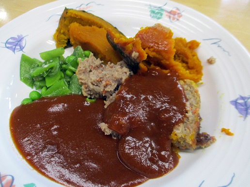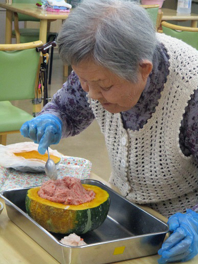 ハロウィンイベント:かぼちゃの肉詰め ~デミグラスソースを添えて~ 2019.11.07 10月31日(木)ハロウィンイベントとしてデイサービスの昼食にかぼちゃの肉詰めを作りました。 かぼちゃはまるごと1つ使用し、綿の部分を取り除きそこへお肉を詰めました。そして、オーブンで焼いたら出来上がり。 出来上がった肉詰めをお皿に取り分け、昼食にいただきました。 柔らかくとても美味しかったです。