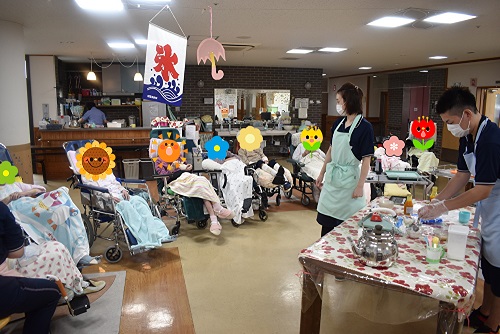 かき氷 2021.07.12 7/10(土)北館1階ではご利用者様がお楽しみ食にてかき氷を食べました。 職員がかき氷機で削り、甘いシロップをかけたらかき氷の完成! 梅雨時期で熱くなった身体もひんやり!美味しく頂きました。 関西地方では7/12(月)にも梅雨明け宣言が出るのではないかという事でいよいよ夏本番です。 皆様も熱中症等に気を付けて元気にお過ごしください。