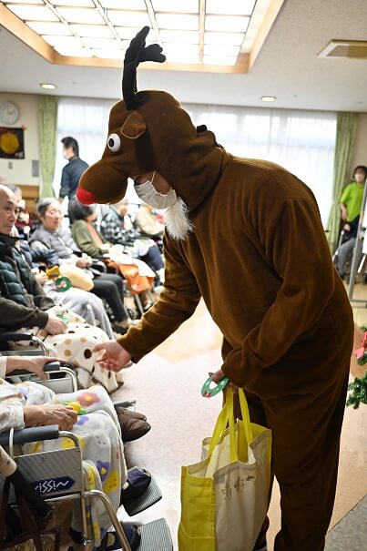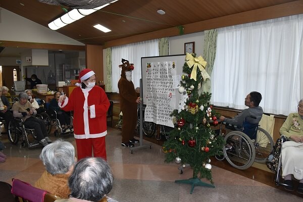 クリスマス会 2023.12.26 12月23日(土)にクリスマス会を開催しました。 サンタクロースと一緒に歌を歌い、クリスマスリースのプレゼントがありました。 そしてお昼には厨房のラフト様が腕によりをかけたチキンが出ました! 美味しくてペロリと平らげました。 とても楽しいクリスマスを過ごすことができました。