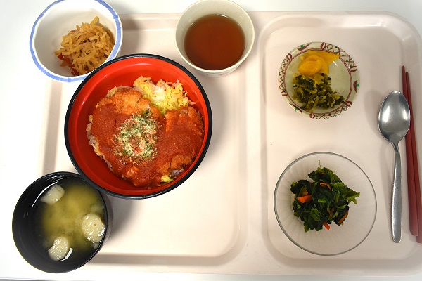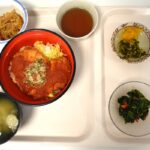 29(肉)の日 2024.03.01 2月29日(木)は毎月お楽しみの肉の日でした。 本日のお昼ご飯はとりトマ丼! 炊き立てのご飯に茹でたキャベツ、チキンカツを乗せたっぷりのトマトソースとチーズがかかっていました。 チキンカツにトマトの酸味とチーズが相性抜群でした。 皆さんぺろりと完食されていました。