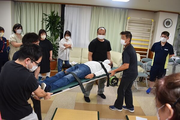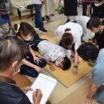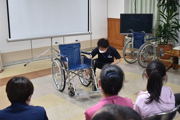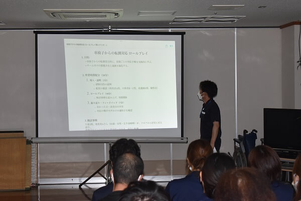 サービス向上研修会(安全・事故発生防止) 2025.08.19 8月の施設内研修では安全・事故発生防止の研修を実施しました。 利用者が車イスから転倒したという想定で、どのように対応を行うかのロールプレイングを行いました。 そのあと車イスの点検の確認事項についても研修を行いました。 ロールプレイングでは活発に意見が飛び交った良い研修になりました。