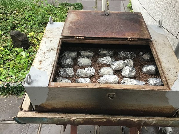 ガンガンの炭火で本当の石焼き芋完成!!