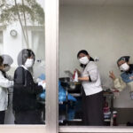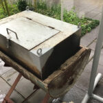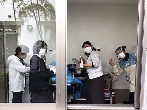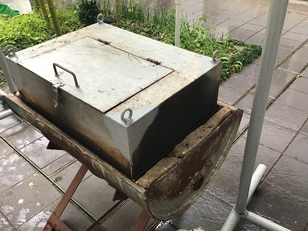 厨房で下処理した芋。事務所女性陣がホイル巻き。焼き芋機のメンテナンス担当。