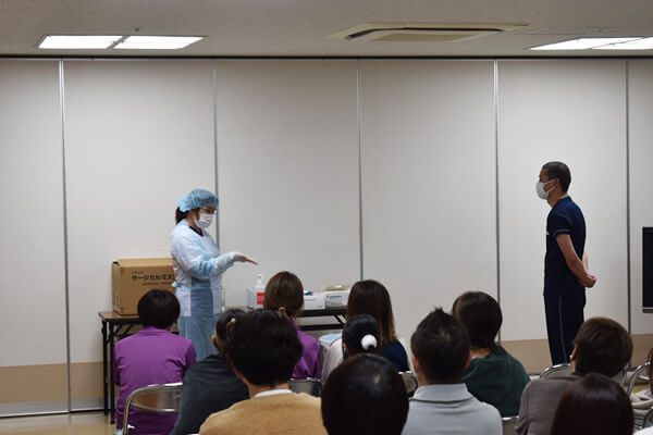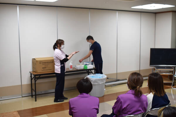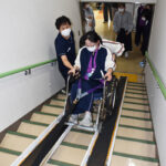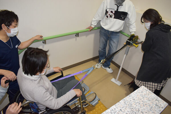 BCP研修② 2026.03.16 2月、3月にBCP研修(自然災害、感染症)を行いました。 今回の自然災害の研修ではエレベーターが使用できない想定で、車イスの利用者を2階にあげる実働訓練を行いました。 階段にスロープを設置してハンドウインチを使用して2階まであげました。 ハンドウインチを使用しているので女性の力でも楽に引き上げることができました。 感染症の研修は感染症が発生した際のガウン等の正しい着脱方法について訓練しました。 新入職員もいるので正しい着脱方法は繰り返し研修を行うことが大切です。