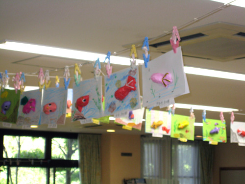 | H23.09.22 | 【お知らせ】 デイサービスでは金魚作りを行いました。新聞で型を作り、上から色紙をはっています。 作品をかざるとホールの中がとても涼しげにみえました。 |