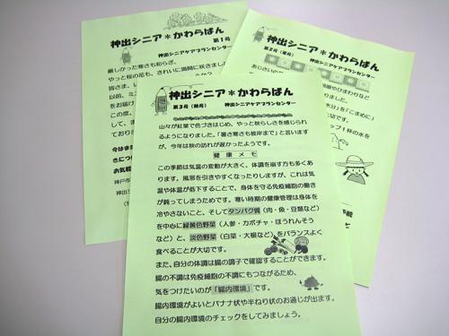 | H23.12.14 | 【お知らせ】 ケアプランセンターでは、ミニ生活情報誌の「神出シニア*かわらばん」をご利用者様、ご家族様、近隣住民の方にお配りしています。「健康メモ」や「介護保険豆知識」などわかりやすい内容を掲載しています。ご希望の方は連絡を頂ければ送付いたします。お気軽にお問い合わせください。 電話 078-965-3955(ケアプランセンター直通) |
