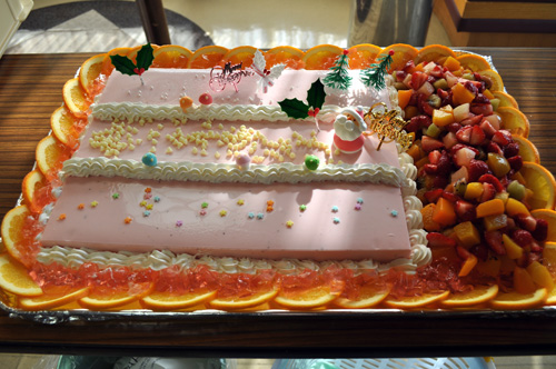 | H23.12.21 | 【お知らせ】 12月恒例、クリスマス会では、サンドイッチ、フライ、スープ、ジュース、チキン料理などのオードブルやピンクがかわいいデコレーションケーキなどを食べて楽しみました。午後からは、私たちクリスマス担当メンバー4人が練りに練ったレクリエーションで利用者の皆様とおおいに歌い笑って過ごしました。楽しかったですよ!! |