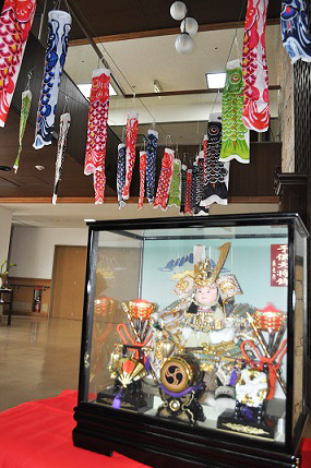 【お知らせ】 「やねよりたかい こいのぼり・・・」桜が終わるとはや5月「端午の節句」ですね。 玄関ではこいのぼりとかぶとがお出迎え。 |