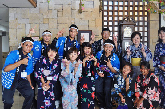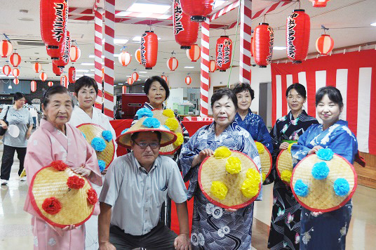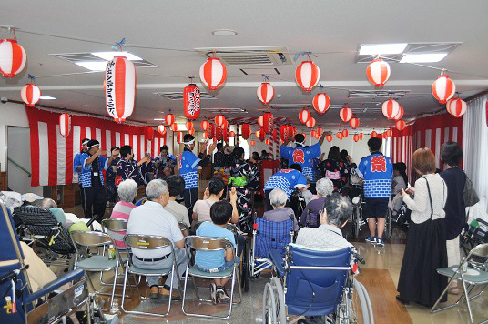 8/20(日) 盆踊りが開催されました。 正面玄関では、ポップコーンと綿菓子が振る舞われました。 踊り会場では踊りの村井先生をはじめ沢山の方にお越しいただきました。 本当にありがとうございました。 7月よりミャンマーから留学生が来ており初参加。利用者とも楽しい1日を過ごしました。 最後は職員での記念撮影。 |
