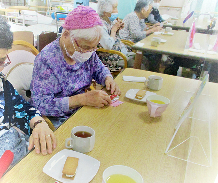 利用者様も「今回のおやつは知っています」と笑顔で話され、北海道旅行のお話を伺いながら、美味しく楽しく頂きました。