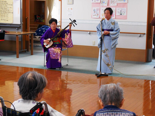 三味線の音に合わせて、入所者の皆様が歌を歌いとても、喜ばれていました。