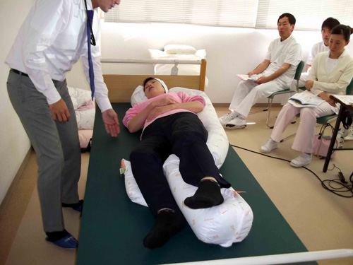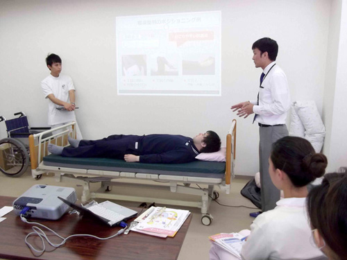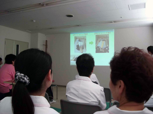 【お知らせ】 5月18日に会議室において褥瘡研修会を開催しました。前回に引き続き(株)ケープの岩田氏による研修でしたが、多数の参加者のもとクッション等を使用しながらポジショニングの方法を勉強しました。今後も褥瘡委員会を中心に活動していきます |