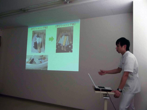 | H23.7.27 | 【お知らせ】 褥瘡予防研修会を開催しました。伊々田理学療法士によるポジショニングについて、入院患者の症例を使った研修でした。今後の褥瘡予防に活かせるように継続してやっていきます。 7月30日日は感染予防の研修会を予定しています。 |