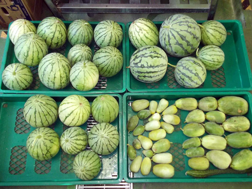 | H23.8.16 | 【お知らせ】 スイカとメロンの最後の収穫を行いました。患者さんにもゼリーにするなど食べていただき喜んでもらいました。野菜作りは患者さんや面会の人にいろいろアドバイスしてもらい大成功でした。今後も喜んでもらえるように野菜作りに挑戦していきたいと思います。 |