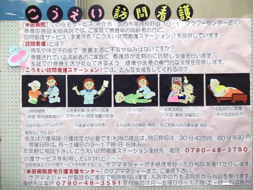 | H23.8.16 | 【こういえい訪問看護ステーションからのお知らせ】 お知らせしていました在宅介護サービス啓発事業を15日から市立加西病院で開催中です。パネルで案内していますが分からないことやお困りのことがありましたら、加西市内だけでなく近隣の地域まで訪問しますのでご連絡ください。 |