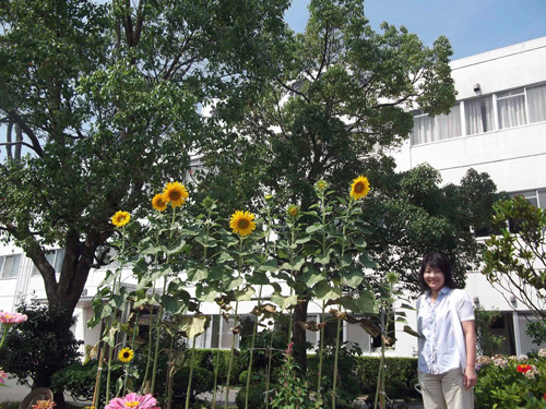 | H23.8.19 | 【お知らせ】 背丈を超える向日葵がようやく大輪の花を咲かせました。鮮やかな黄色の花は青空によく映え、心を和ませてくれてます。 |