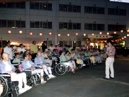 | H23.8.29 | 【お知らせ】 8月27日に納涼花火大会を開催しました。準備も整い患者さんが外に出てこられて間もなく、雨が降り出し残念ながらデイルームでの開催となりました。たこ焼き、やきそば、お好み焼き、おでん、かき氷をおいしそうに食べられていました。自然には勝てず打ち上げる事のできなかった花火は、楽しみにされている患者さんや家族も多く、後日に延期することとします。 |