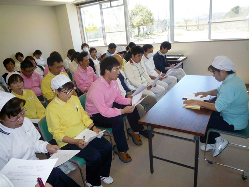 | H23.4.6 | 【お知らせ】 4月6日医療安全管理研修会を開催しました。介護職員の栗岡ゆかりさんが 笑医塾 塾長の高柳和江先生の研修「笑いの医力と感動で医療現場が変わる」に参加して職員に笑いのすばらしさ、効果などを伝えてくれました。 多数の参加者のもと、ゲームを取り入れるなどして楽しい研修会となりました。 今後も職員一人一人が余裕と笑いをもって医療・介護に取り組んでいけるようにしていきたいと思います。 |