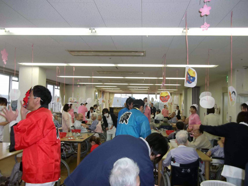 | H24.2.17 | 【お知らせ】 2月15日に遅くなりましたが節分祭を行いました。職員が鬼になり豆まきを行い、宮地副院長による恒例の腹話術にピアノ演奏を楽しみ、患者様のいい笑顔が見られた楽しい行事となりました。 |