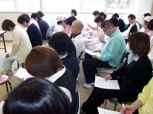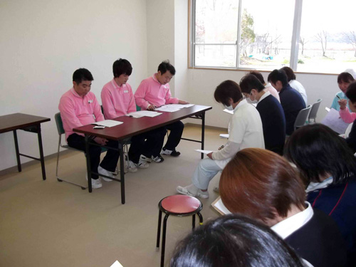 | H24.3.21 | 【お知らせ】 医療安全研修会を開催しました。今回は事前に介護職員3人が研修を受講し伝達講習を行いました。ヒヤリハット報告のねらい、事故分析の基礎等わかりやすい研修となりました。 今後も新人研修や各委員会での研修を計画し職員の資質向上に努めていきます。 |