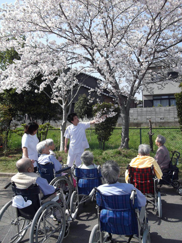 | H24.4.12 | 【お知らせ】 例年より少し遅いですが病院の桜も満開になりました。患者さんも天気のいい日は花を見ながら散歩しています。 18日には患者さんの花見会を予定しています。 |