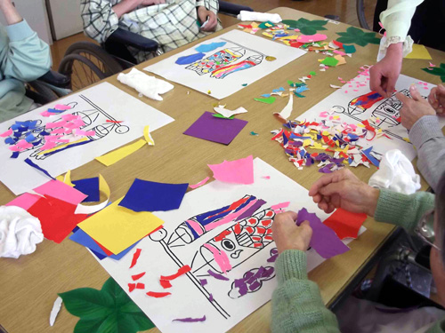 | デイルームからこいのぼりを見ながら貼り絵をしました。 色とりどりのこいのぼりが完成し楽しいひと時を過ごしました。 |