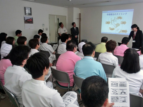 | H24.8.8 | 【お知らせ】 感染対策委員会主催の研修会を行いました。今回はサラヤ株式会社の担当者による「手指衛生」についての研修でした。手指衛生の重要性、手洗いの実践方法、手指消毒等基本を再確認できました。 手洗いがきちんと出来ているかを確認できる機器を使用して手洗い前と手洗い後を確認すると、手洗いが不十分の箇所があるのがわかり、改めて手洗いの仕方を考えさせられました。 |