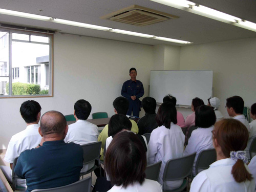 | H24.10.25 | 【お知らせ】 消防訓練を行いました。今回は加西市消防署より地震についての講義を受けました。阪神淡路大震災、東日本大震災へ消防隊として派遣された実体験をもとに話をしていただきました。地震はいつ起こるかわからず突然の事態に備え日頃から意識付けすることが大切であること。また当院は地域の避難所とし期待されていることも話されました。 講義終了後消火訓練も行いました。今後も防災意識を高めていきたいと思います。 |