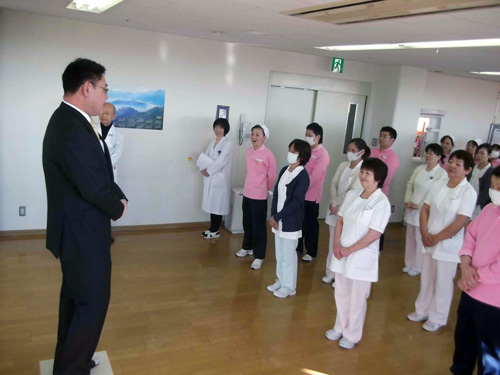 | H25.04.01 | 【お知らせ】 25年度が始まり辞令交付を行いました。新しく介護課長を任命し接遇委員会も発足させるなど、新たな気持ちで職員のレベルアップ、サービスの向上に努めていきます。 |