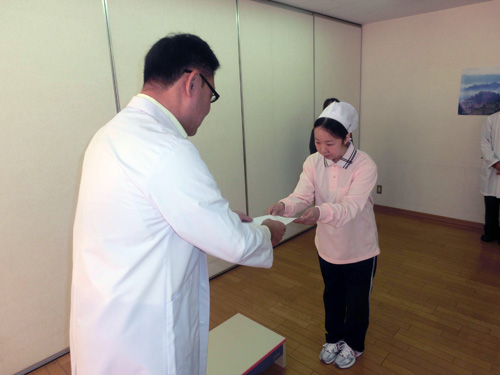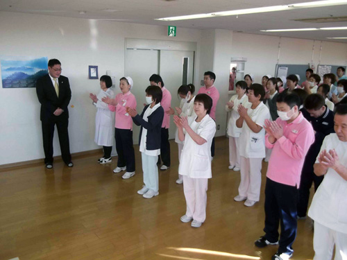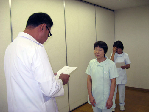 | H25.09.02 | 【お知らせ】 全体朝礼で辞令交付を行いました。9月1日より看護部長、看護師長を任命し新体制がスタートしました。 各部署が協力して少しでも良い入院環境を作っていきたいと思います。 |