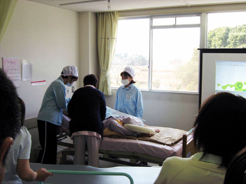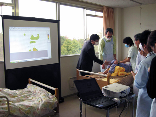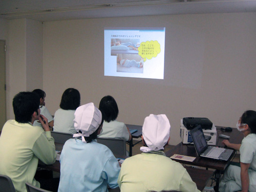 | H25.03.27 | 【お知らせ】 褥瘡対策研修会を開催しました。前回に引き続き株式会社モルテンの瀬川氏によるポジショニングの研修でしたが、マットレスの選定、ポジショニングの重要性を再認識しました。 特に介護職員には新入職員が多く実際の除圧を測定しながらの研修で勉強になったようでした。 4月からは接遇委員会を発足させ新人教育をはじめ職員の資質向上に努めていきます。 |