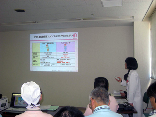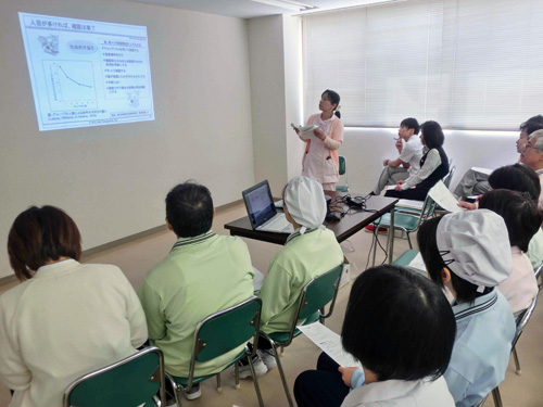 | H25.05.16 | 【お知らせ】 感染対策委員会による研修会を開催しました。今回は「すぐに役立つ感染対策のキーポイント」ということで明治製菓ファルマ株式会社さんを講師に招き研修を行いました。 医療現場での感染の発生事例や原因、制御の基本等をわかりやすく講義していただき今後の感染対策に活かしていきたいです。 |