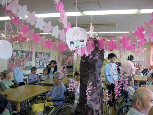| H25.04.17 | 【お知らせ】 行事委員会によるお花見会を開催しました。残念ながら外の桜は散りましたが職員の手作りの桜は満開で患者さんも寸劇や歌を歌ったりと楽しみました。 |