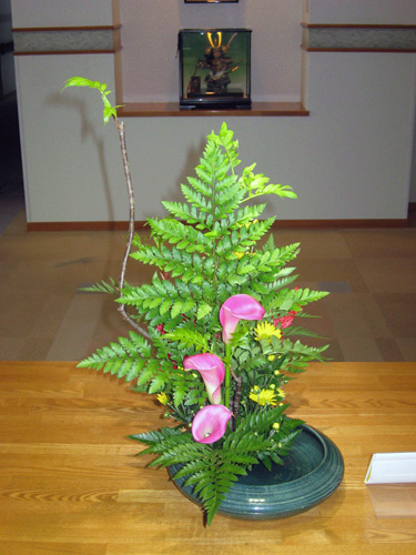 | H25.05.27 | 【今週の光風流】 レザーファンの濃い緑とナナカマドの黄緑の葉、真夏を思わせるヤリケイトの赤と珍しいピンクのカラーの優しさのコントラストが、初夏を彩っています。 |