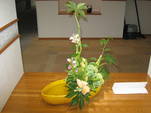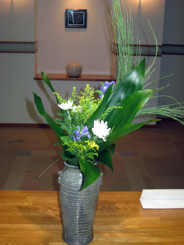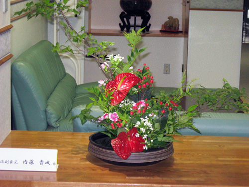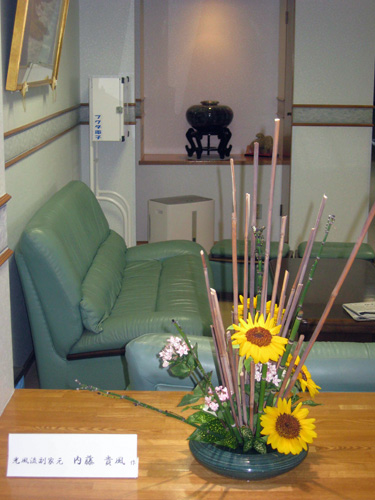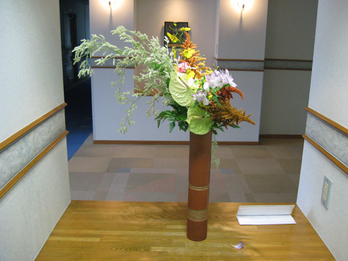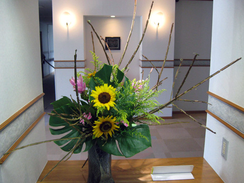 | H25.09.18 | 【今週の光風流】 エンコスギが自由に伸び炎が燃えているような力強さを感じさせてくれます。面会の方だけでなく職員にも好評の為、職員対象の生け花体験教室開催を予定しています。 |