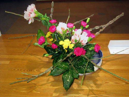 | H25.06.12 | 【今週の光風流】 可愛いいカーネーション、小菊、ゴテチャの原色の鮮やかさと対照的なニシキギが力強く横への動きを演出。ニシキギと同じ動きをしているゴテチャもおしゃれ。少し見える花器の水が涼しげです。 |