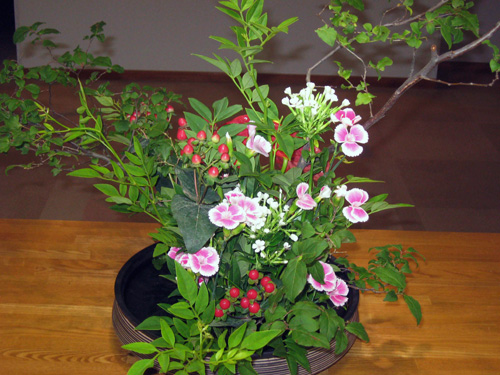 | H25.07.17 | 【今週の光風流】 いろんな方向に延びるドラゴン柳とその中にある色とりどりの花が、花火のような感じで夏らしさを感じさせてくれています。 |
