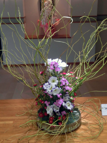 | H25.12.11 | 【今週の光風流】 雪景色からガラッと変わり、円を描いた柳とその中に花言葉が高貴のオリエンタルリリーが上品に見え、正月らしくなりました。香も楽しめます。 |