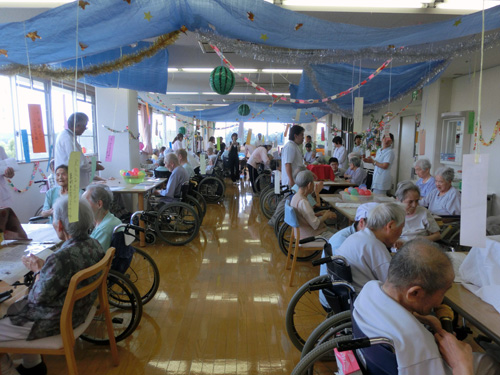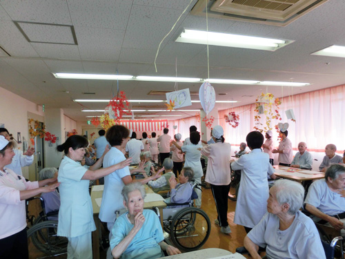 | H25.07.19 | 【お知らせ】 行事委員会では季節に応じた行事を企画しています。少し遅くなりましたが七夕会を行いました。 短冊に願い事を書き笹に飾りました。 ゲームをしたり星を模ったゼリーをおやつに提供し、患者様もとても喜んでおられました。 |