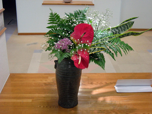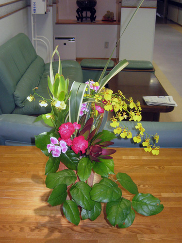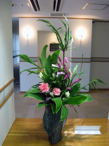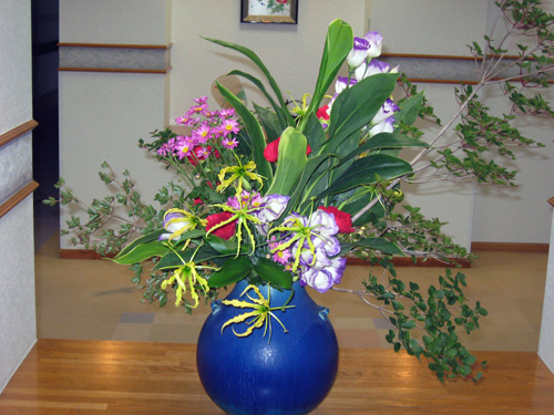 | H25.07.31 | 【今週の光風流】 暑い日が続く中、涼しげな青い花瓶に可愛いピンクの小菊、赤いカーネーション、白と紫の綺麗なトルコキキョウが綺麗な調和で、熱い中お見舞いに来られた方々も足を止めて見てをられます。表裏で違った見方が出来ますので二度楽しめます。 |