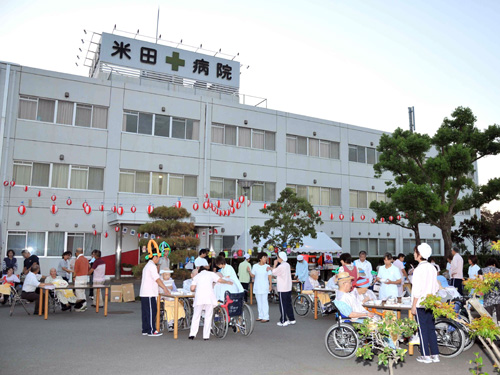 | H25.08.26 | 【お知らせ】 米田病院納涼花火大会を行いました。朝から雨が降り天気が心配でしたが夕方には絶好の祭り日和となりました。患者さんはラフトさんが作ってくれたやきそば、たこ焼き、お好み焼き、おでん、綿菓子、かき氷を食べ大満足。 ナイアガラの滝を始め打ち上げ花火は患者さんだけでなく、家族に職員も興奮していました。 夏のいい思い出になりました。 |