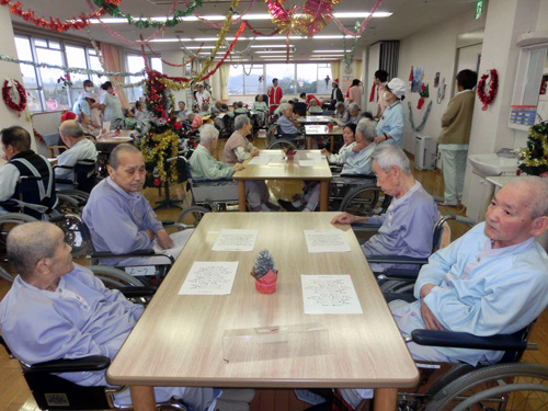 | H25.12.19 | 【お知らせ】 クリスマス会を開催しました。サンタの格好をした職員がプレゼントを配ると嬉しそうに喜んでおられました。 職員による聖歌隊の歌やハンドベルも披露され大変楽しいクリスマス会となりました。 |