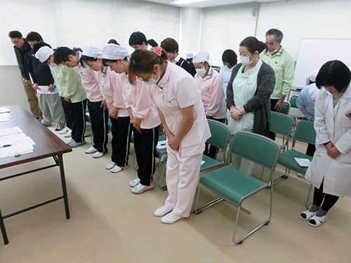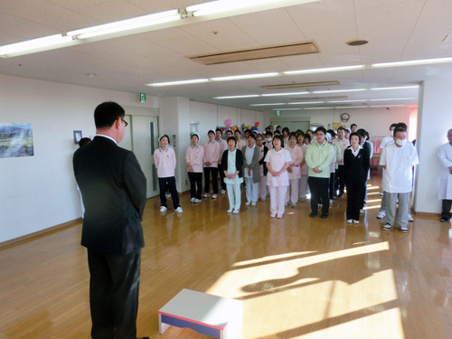 | H26.04.07 | 【お知らせ】 全体朝礼で26年度委員会の辞令交付を行いました。各種委員会において研修、院内巡回、新しい取組等を行いより良い入院環境、職場環境を作っていきたいと思います。 |