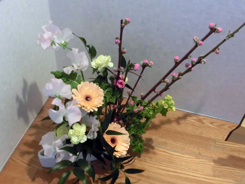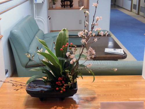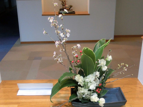 | H26.02.04 | 【今週の光風流】 先週蕾だった啓翁桜が満開です。外は雪がちらついていますが、玄関に入ると春を感じることができます。 |