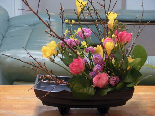 | H26.02.10 | 【今週の光風流】 先週は啓翁桜が綺麗に咲いていましたが、今週はフリージア、チューリップ、ラナンキュラス、キャンディータクト、オンシジウムが色とりどりに春を感じさせてくれます。まだ蕾ですが梅の花が咲くのも楽しみです。 |