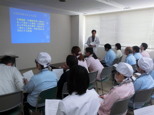 【お知らせ】 医療安全管理委員会による介護サービスのリスクマネジメント研修を開催しました。介護事故と法的責任、損害賠償責任の発生要件を事例をもとに学びました。 医療安全の意識を高め事故防止に努めていきたいと思います。 |