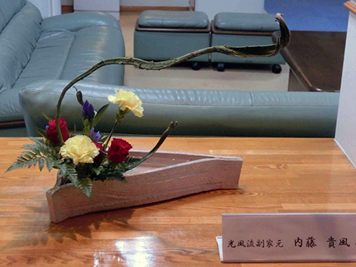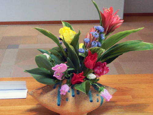 | H26.04.23 | 【今週の光風流】 縦に延びた竹のような花器に生けられている花が、見る方向により春らしさや、初夏を感じさせてくれて楽しめます。 |