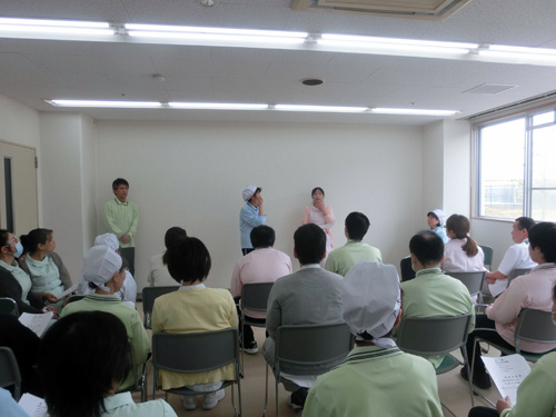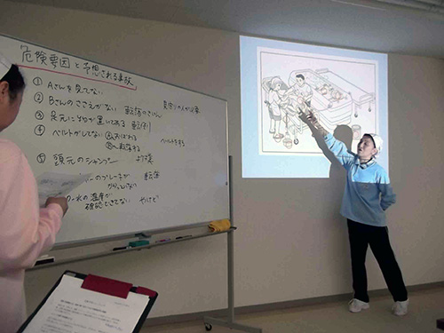 | H26.03.26 | 【お知らせ】 医療安全研修会を開催しました。今回は介護職員を中心としグループに分かれて危険予知トレーニングを行いました。日常の介護現場で起こりうる危険を予知し未然に防止するため、気づきと発見の研修で早速業務に活かしていけるようにしていきます。 |