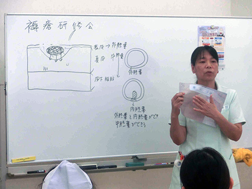 | H26.05.07 | 【お知らせ】 褥瘡研修会を開催しました。今回はモイストケア(湿潤治療)についての研修でしたが、米田病院では食品用ラップを使用したラップ療法をを行っております。 以前のようにガーゼや消毒液を使用せずに傷もよくなっているので、今後も褥瘡ゼロを目指していきます。 |